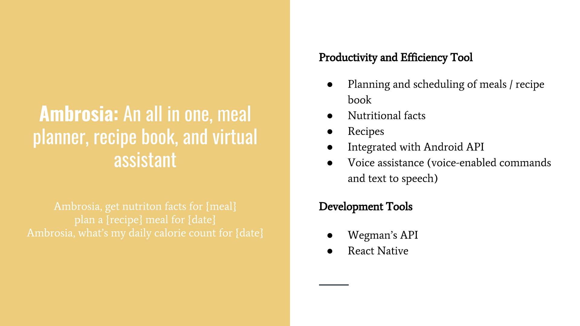 Ambrosia also has voice functionality, you can plan meals for certain dates, check your calorie count, and get the nutritional facts, all with the tap of a button and a few words.
