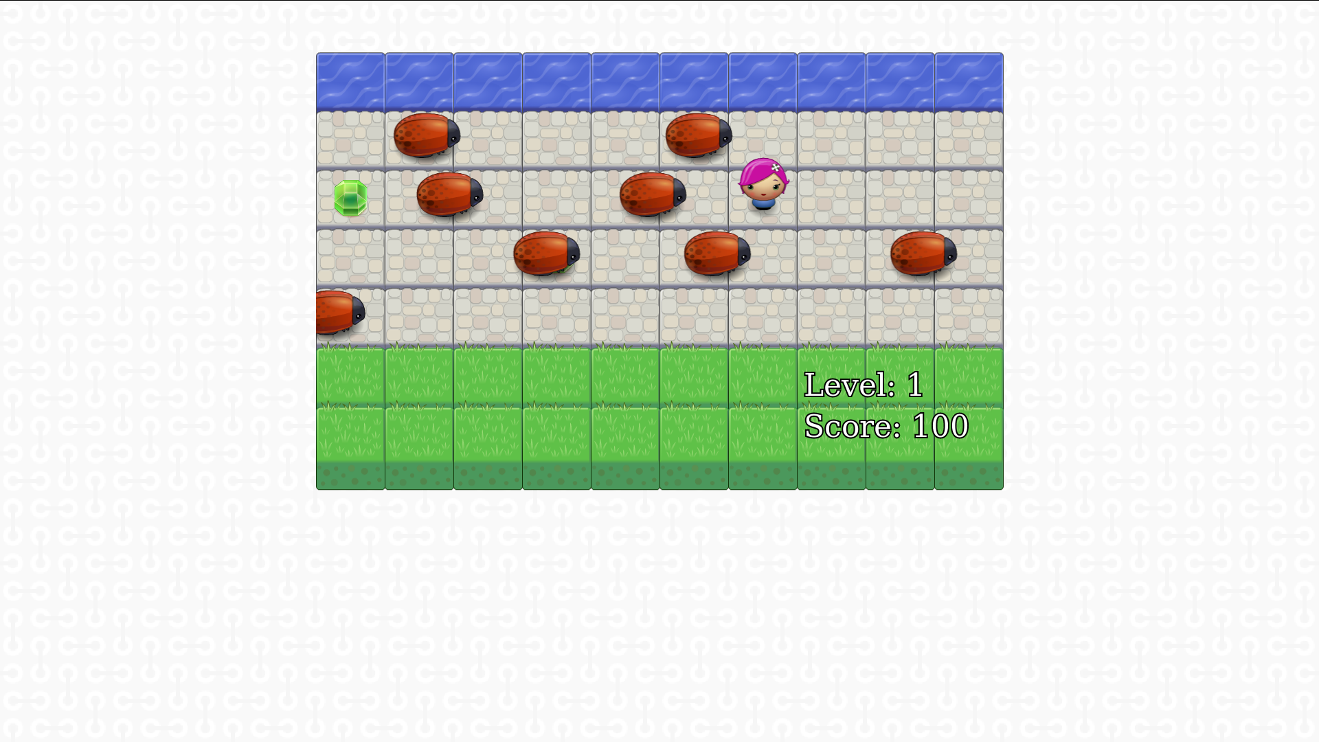 Completed as part of Udacity's Front End Nanodegree Program. In this game you have a Player and Enemies (Bugs). The goal of the player is to reach the water, without colliding into any one of the enemies. The player can move left, right, up and down. The enemies move in varying speeds on the paved block portion of the scene. Once a the player collides with an enemy, the game is reset and the player moves back to the start square. Once the player reaches the water the level is won. The player can pick up gems along the way to increase their score, which can be seen in the bottom left corner along with the level the player is currently on. The difficulty increases as the level increases.