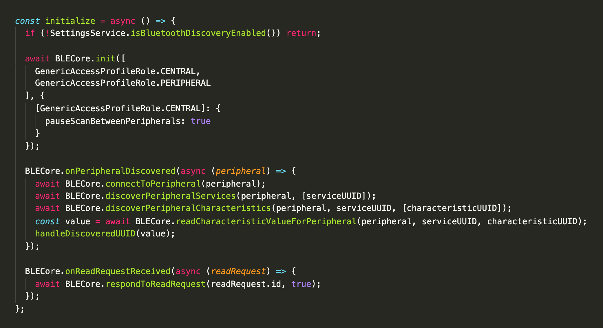 I wrote code in Kotlin and Swift, wrapping minimum native Android and iOS BLE functionality in a cross-compatible API for React Native. Then on the React Native side, in the true "learn once, write anywhere" fashion, I used the API I exposed with Typescript and ran it on both Android and iOS devices.
